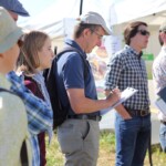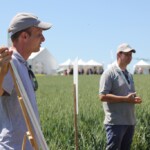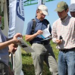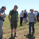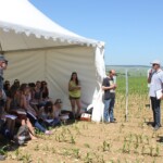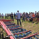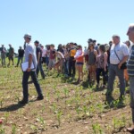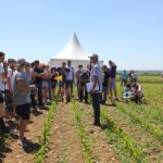 Die Gruppe wurde zu Beginn des Tages am Stand des französischen Aktionsplans zur Pestizidreduzierung „plan écophyto“ empfangen. Arnaud Joulin, Mitarbeiter des Landwirtschaftsministerium des Verwaltungsbezirks Lothringen (DRAAF) und regionaler Projektleiter des Programms Ecophyto, führte die Exkursionsteilnehmer in den französischen Aktionsplan, seinen strukturellen Aufbau, seine Indikatoren und seine Ziele ein. Obwohl zur Halbzeitevaluierung des Aktionsplans klar ist, dass das für 2018 gesetzte Ziel einer Pestizidreduzierung um 50 % auf Landesebene nicht erreicht wird, konnte im Leitbetriebsnetzwerk „réseau DEPHY Ferme“ insgesamt bereits eine signifikante Pestizidreduzierung erreicht werden. Damit das finanzielle Risiko bei Versuchen alternativer Anbaumethoden nicht von einem praktizierenden Landwirt getragen werden muss, werden neue Methoden zuerst im Versuchsbetriebsnetzwerk „réseau DEPHY EXPE“, zu dem auch die besichtigte Forschungsstation ALPA gehört, getestet. Bei den Versuchen wird zwecks Pestizidreduktion an unterschiedlichen Stellschrauben gedreht, bis hin zu einer Umstellung, bzw. Erweiterung der Fruchtfolge. Bei einem anschließenden Rundgang über die Versuchsfelder konnten so jeweils eine dreijährige und eine erweiterte fünfjährige Fruchtfolge im 4. Jahr begutachtet werden. Mit versetzten Saatterminen, mechanischer Unkrautbekämpfung, Sortenmischungen und Untersaaten, kombiniert mit verringerter Spritzmitteldosierung, wurden sowohl positive als auch negative Aspekte vielversprechender Methoden gezeigt.